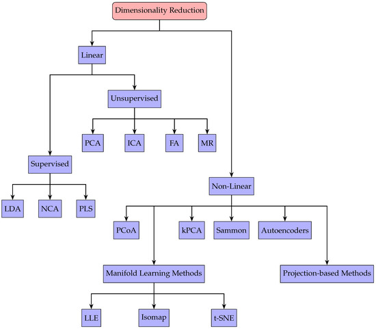 On the nonlinear side, these methods handle more complex data relationships at the expense of higher computational requirements. Kernel Principal Component Analysis (kPCA) extends PCA through kernel functions that map data into higher-dimensional spaces, while Sammon mapping and Principal Coordinates Analysis (PCoA) each seek to preserve distance relationships in reduced form. Manifold learning algorithms like Isomap, Locally Linear Embedding (LLE), and t-distributed Stochastic Neighbor Embedding (t-SNE) uncover underlying manifold geometry by conserving local or global distances [82]. Finally, autoencoders form a projection-based family of neural network approaches that learn compressed latent representations of high-dimensional inputs without explicit labels [81,82].