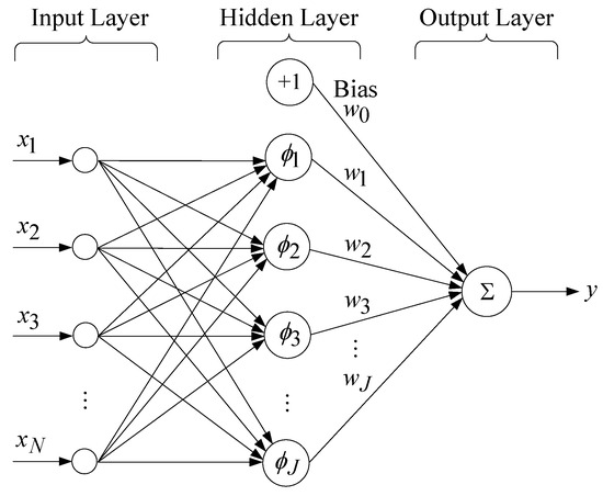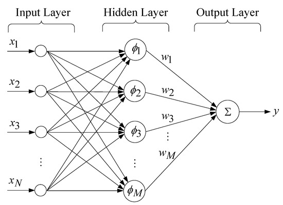 One should be aware that the complexity of training the RBFNN relies on the training elements , and the hidden neurons . The complexity normally follows an increment. To reduce the difficulty in calculation and the network complexity, a generalized RBFNN has been considered, as illustrated in Figure 4 [51]. This model generalization is performed using the Galerkin scheme. The number of hidden layer nodes is (often less than the number of training examples ). One of the weights in the output layer is assigned as a bias (i.e., a variable unrelated to the data), and the related RBF is treated as a constant of positive one. While the number of training elements grows, the real-time computational load becomes higher as well. The optimal number of hidden neurons and the effective training algorithms can handle the computational load. Cross-validation can be used to decide the optimal number of hidden neurons and discover how to stop training at the best time [52].