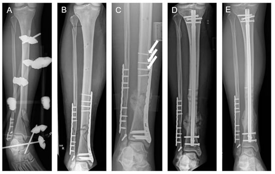 Figure 1. A 29-year-old male patient suffering from a lower leg fracture after a previous and healed ankle fracture in the past (A). The patient was initially treated by plating osteosynthesis of the tibia and fibula (B). At 4 months after surgery, the patient showed an implant failure ((C); arrows) and signs of a hypertrophic non-union as a disturbed bone healing course. After revision surgery (D), the patient underwent a clinically uneventful course and demonstrated full bone healing 6 months post-revision surgery (E).