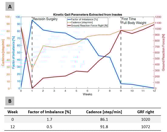 Figure 2. Temporal evolution of kinetic parameters, including a factor of imbalance in percentage, cadence in steps per minute, and ground reaction force of the fractured right leg in Newtons, over a 12-week recovery period following revision surgery (A), and exact values for week 0 in grey and week 12 in white (B).