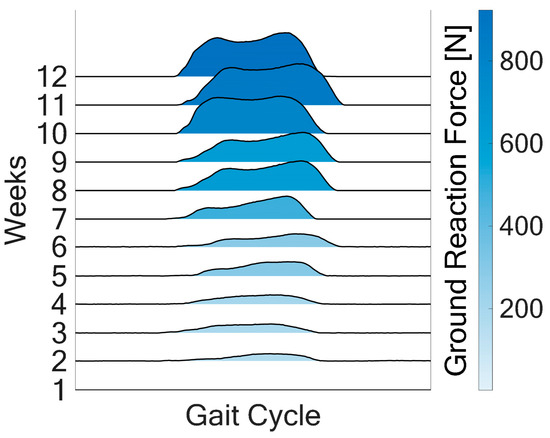 Figure 3. Illustration of the evolution of the ground reaction force in the right leg during a single gait cycle for the first seven weeks.