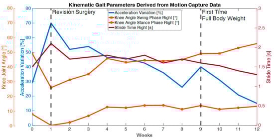Figure 4. Temporal progression of kinematic parameters over a 12-week recovery period following a revision surgery.