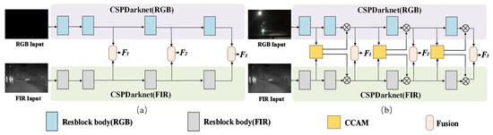 - We propose an RGB-FIR multimodal YOLO backbone network framework based on a multi-level fusion strategy, as shown in Figure 1d, consisting of an RGB-FIR parallel backbone network, a cross-modality contextual attention model, and a multimodal feature fusion module.