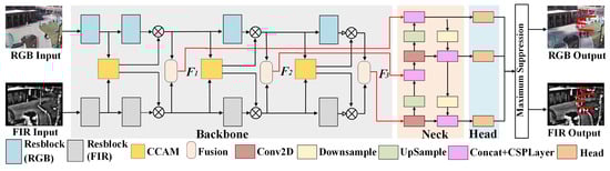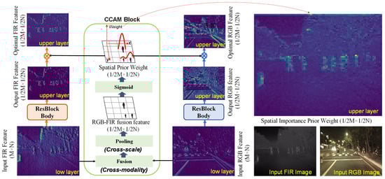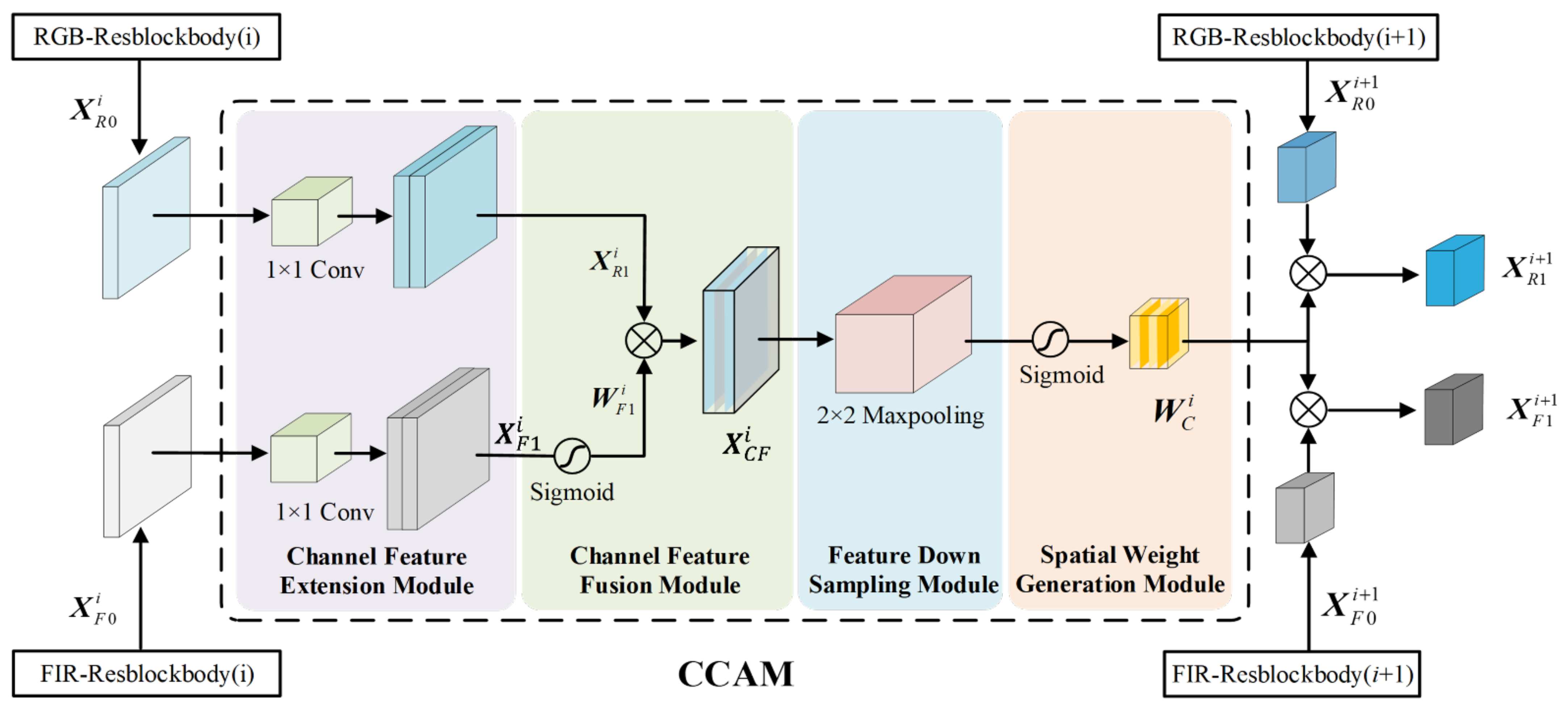 - A CCAM model is designed for the front end of the RGB-FIR parallel backbone network to achieve cross-modality and cross-scale complementarity between adjacent scale features.