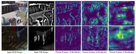 - Spatial weight generation module: The SWG module is shown in the skin section of Figure 3. The SWG module generates spatial importance weight values for the RGB and FIR channel features of the i+1th Resblockbody. The specific process is as follows: A sigmoid function is applied to normalize down-sampled fusion feature map to generate a feature space importance weight matrix , where