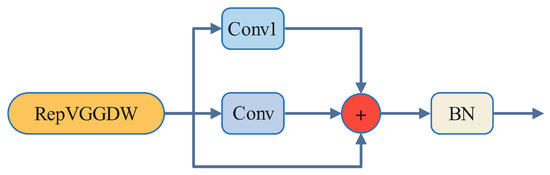 In the design of the RepViTBlock, the data flow first passes through the token mixer, which utilizes depthwise separable convolution (RepVGGDW). As illustrated in Figure 3, RepVGGDW consists of two convolutional layers: depthwise convolution and 1 × 1 grouped convolution. The outputs of these two convolutions are summed and then fused with the original input to create a residual connection, followed by normalization through a batch normalization (BN) layer before the output. This stage primarily processes features from local or neighboring regions, enhancing the model’s ability to capture spatial details. The 1 × 1 grouped convolution reduces computational load by dividing the convolution operation into multiple groups, with each group processing only its assigned input channels rather than all input channels. The RepViTBlock integrates depthwise separable convolution and 1 × 1 grouped convolution, utilizing structural reparameterization techniques to decrease both the number of parameters and computational requirements. This approach enables the module to maintain efficient feature processing while keeping computational costs low.