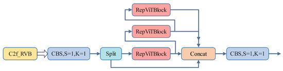 The C2f module in YOLOv8 employs multiple bottleneck structures for feature fusion and information propagation. The bottleneck module incorporates feature partitioning and residual connections. However, the repeated use of the bottleneck module for feature processing increases both the complexity and computational burden of the network. To address this issue, the C2f_RVB enhances the network’s feature processing capability by utilizing the RepViTBlock to replace the bottleneck in the C2f module. This design allows C2f_RVB to integrate local and global information more effectively, thereby improving the richness and accuracy of feature representation. Additionally, the implementation of the RepViTBlock optimizes computational efficiency by reducing the number of parameters and computational requirements through the use of depthwise separable convolutions. The structure of C2f_RVB is illustrated in Figure 4.
