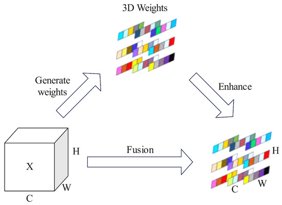 The attention mechanism can generally be categorized into spatial attention mechanisms and channel attention mechanisms. The spatial attention mechanism evaluates each pixel in the image and computes a weighted average of the scores to emphasize areas of greater focus. In contrast, the channel attention mechanism integrates and associates information across different channels, thereby enhancing the model’s representational capability. Compared to traditional spatial and channel attention mechanisms, the SimAM attention mechanism introduces a unified weight attention module that can directly compute three-dimensional attention weights. The integration process of the three-dimensional attention mechanism is illustrated in Figure 5. SimAM is a non-parametric attention mechanism that enhances the responses of important feature channels by calculating the inter-channel relationships of input features and making dynamic weight adjustments. The core idea is to improve the model’s representational capacity by adaptively learning the weights of feature channels without increasing the number of additional model parameters.