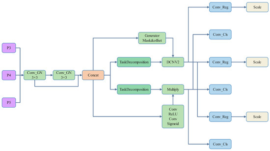 Due to issues such as misdetections and high miss rates in detecting small targets in chip surface defects using the traditional YOLOv8 algorithm, this paper proposes the addition of a task-aligned dynamic detection head (TADDH) to YOLOv8 to address these problems. The structural diagram is shown in Figure 6. Single-stage object detection typically optimizes both classification and localization tasks, often adopting a dual-branch head design. However, this approach may lead to spatial inconsistency between predictions. Additionally, such a dual-branch design may result in a lack of interaction between the two tasks, potentially causing inconsistent predictions during task execution. Inspired by the task-aligned one-stage object detection (TOOD) concept proposed by Feng et al. [34], this paper introduces a task-aligned single-stage object detection head (TADDH). The TADDH aims to more accurately align the two tasks by implementing a new head structure and an alignment-oriented learning approach. Specifically, TADDH dynamically adjusts the importance of features across different tasks by introducing a hierarchical attention mechanism and enhances the synergy between classification and localization tasks through the design of a novel gradient alignment strategy.