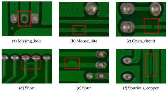 The PCB defect detection dataset (PKU-Market-PCB) [35] is derived from a publicly available collection released by the Intelligent Robotics Open Lab at Peking University. This dataset includes six primary defect categories: missing hole, mouse bite, open circuit, short, spur, and spurious copper. In total, it comprises 693 images, which are partitioned into training, validation, and test sets in an 8:1:1 ratio. The image resolution is 3034 × 1586. Representative examples of each defect category are presented in Figure 8.