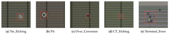 A self-built chip surface defect dataset was manually labeled using the LabelImg annotation tool, and the dataset consists of five categories: Tre_Etching, Pit, Over_Corrosion, CT_Etching, and Terminal_Error. As shown in Figure 9a, Tre_Etching typically exhibits an irregular shape, is bright white in color, and features distinct black lines. As shown in Figure 9b, the common characteristic of pits is their circular shape, which is further defined by three features: (1) the center is black, surrounded by a light-colored edge forming a circular spot, and (2) the defect appears as a shallow, light-colored circular area. As shown in Figure 9c, Over_Corrosion is usually circular, with a distinct black center. As depicted in Figure 9d, CT_Etching typically has two features: (1) an irregular shape that matches the surface color, with the black line obscured, and (2) an elliptical or circular shape with a black edge in the center, with the black line obscured. As shown in Figure 9e, Terminal_Error is typically located in the terminal area and affects the real defects of the terminal area’s film layer. The specific quantity of each defect category is shown in Table 1. Additionally, the dataset was augmented using techniques such as flipping, translation, and brightness adjustment, resulting in an increase in the total number of images from the initial 584 to 1594. The dataset was then divided into training, validation, and test sets in an 8:1:1 ratio. The image resolution is 300 × 300. The experiment utilizing our self-constructed chip surface defect dataset aims to validate the performance of our proposed method in more challenging real-world scenarios. Through a comparative analysis with a diverse dataset, we seek to demonstrate the versatility and effectiveness of our approach.