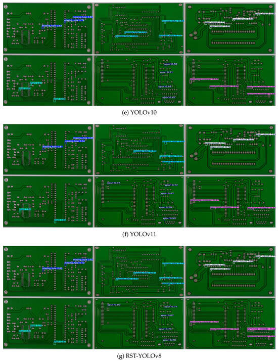 Figure 10 presents a comparison of the detection performance of the RST-YOLOv8 model with that of other algorithmic models in the identification of PCB defects. The analysis of the detection results reveals that, as shown in Figure 10g, the RST-YOLOv8 model not only exhibits an improvement in the confidence levels of the predicted bounding boxes but also rectifies instances of false positives and missed detections observed in other models. Moreover, the model’s enhanced capability to process features of small-sized defects has led to a significant improvement in the detection performance for spur defects. In conclusion, the RST-YOLOv8 model demonstrates strong recognition performance for PCB defects.