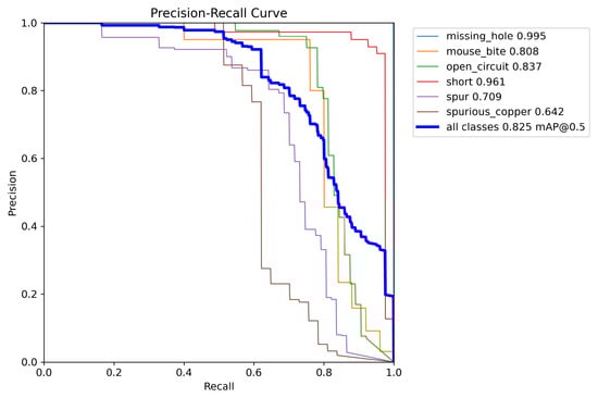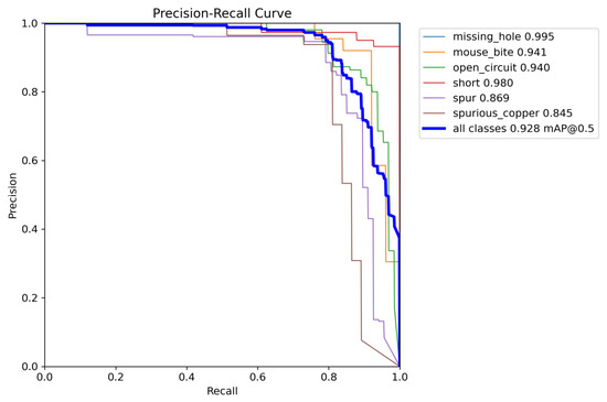 The PR curves presented in Figure 11 and Figure 12 illustrate the experimental results of YOLOv8 and the enhanced RST-YOLOv8 on the PCB dataset. These figures display the mAP@0.5 values for each individual category, as well as the overall mAP@0.5. As shown in the charts, the improved algorithm increases the mAP from 82.5% to 92.8%, yielding an improvement of 10.3 percentage points. Notably, in YOLOv8 detection, the mAP for the “mouse_bite” category is only 0.808, whereas the enhanced model achieves a mAP of 0.941. This highlights a substantial performance gain over the baseline model for this particular category.