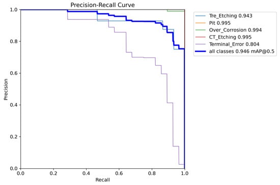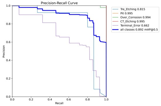 The PR curves presented in Figure 13 and Figure 14 illustrate the experimental results of YOLOv8 and the enhanced RST-YOLOv8 on a custom-built chip surface dataset. These figures display the mAP@0.5 values for each category, as well as the overall mAP@0.5. From the graphs, it is evident that the improved algorithm increased the mAP from 89.2% to 94.6%, yielding a 5.4 percentage point improvement. Notably, in YOLOv8 detection, the mAP value for the “Terminal_Error” category was only 0.662, while the improved model achieved 0.804. This demonstrates a significant enhancement relative to the baseline model for this specific category.