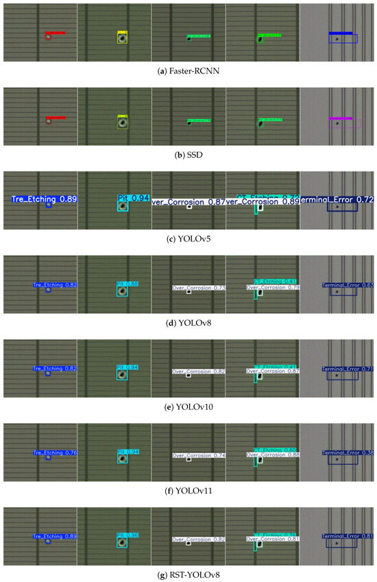 To validate the performance of the improved model, a comparative analysis was conducted using the RST-YOLOv8 model alongside classic two-stage detection algorithms, such as Faster R-CNN, as well as single-stage detection algorithms, including SSD and other variants of the YOLO series, along with other relevant improved algorithms, on a PCB defect detection dataset. The results are presented in Table 5.