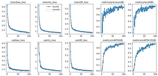 Figure 16 presents the performance evaluation results of the object detection model based on the improved architecture over 100 training epochs, along with an analysis of the loss function and key metrics during both the training and validation phases. The results demonstrate that the box loss, class loss, and distributed focal loss (DFL) all decreased significantly as training progressed, indicating that the model gradually converged and enhanced its accuracy in object recognition and classification tasks. Both precision and recall showed substantial improvements, ultimately stabilizing at a high level, which further validates the model’s efficiency in object detection. Furthermore, the mean average precision (mAP) exhibited consistent improvement across various thresholds, highlighting the model’s strong detection performance even under varying overlap conditions. Overall, the experimental results confirm the model’s effectiveness and robustness for object detection tasks, with the potential for further performance improvements through optimization of the model architecture or an increase in the training data volume.