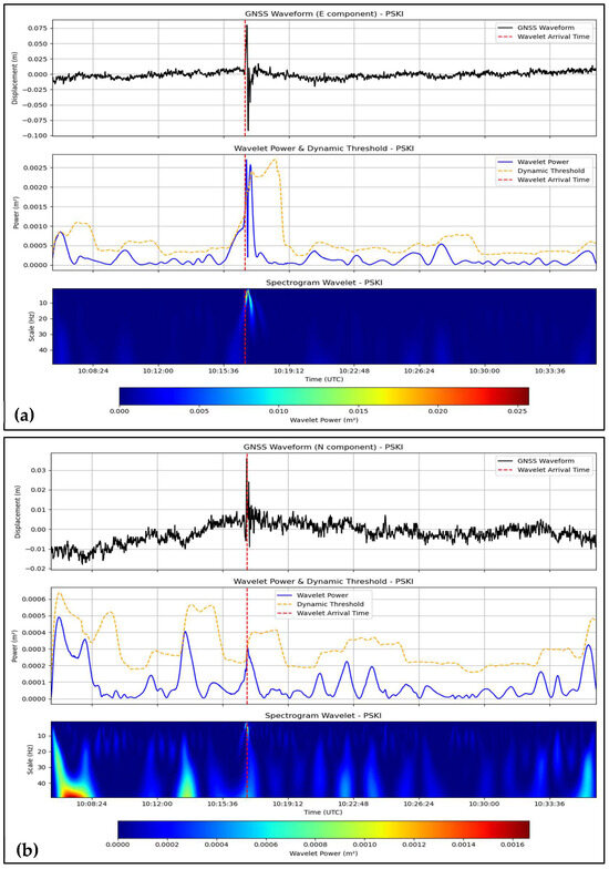 The onset of the P-wave at PSKI (69.62 km) and PKRT (162.26 km) was determined from the GNSS data. At PSKI, the East (E) and North (N) components showed strong wavelet power peaks exceeding the dynamic threshold at 10:16:47 UTC and 10:16:56 UTC, respectively (Figure 2a,b). Verification with PDSI (10:16:26 UTC, 66.6 km) currently has time lags of +21.0 s (E) and +30.0 s (N) (Table 1). At PKRT, both the E and N waveforms of the arrivals at 10:16:10 UTC were clear, and their power peaks were obvious (Supplementary Figure S1). With respect to SDSI (177.6 km, 10:16:37.6 UTC), the discrepancies were −27.6 s (E) and −27.6 s (N). U at both stations yielded bad onsets (e.g., −585.0 s at PSKI, −593.6 s at PKRT, Table 1), where the low power of the wavelet suggested noise-contaminated data. The measurements of the E and N components were accurate within ±30 s, which demonstrates the reliability of the detection of near-field and intermediate-distance locations.