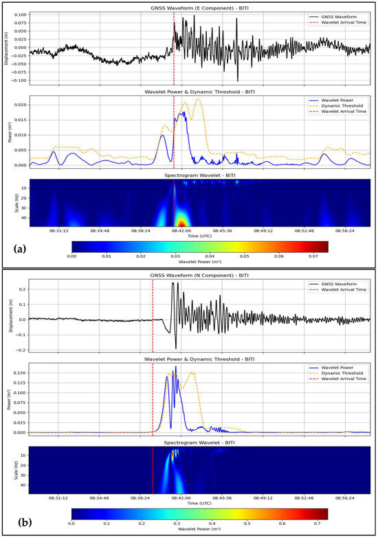 The Up (U) component exhibited systematic and large time lags (e.g., −585.0 s at PSKI, +876.1 s at BITI, +201.8 s at CBAL; Table 1; Supplementary Figures S1–S3), confirming its inconsistent reliability. This issue, likely due to ionospheric, tropospheric, and multipath noise, as well as low vertical antenna sensitivity [31,39,40], persisted despite preprocessing steps, such as iterative outlier removal and least-squares position estimation during PPP-AR processing [23]. The low wavelet power and noise contamination indicate that the Up component is less sensitive to P-wave compressional signals than anticipated [31,39]. Dynamic thresholding (k = 3.0, Section 2.3) also failed to mitigate these effects, suggesting the need for component-specific noise mitigation strategies. To optimize the sensitivity factor k = 3.0, we tested values from 2.0 to 4.0 and found that k = 3.0 balanced false positives and detection sensitivity across all events. Lower values (e.g., k = 2.0) increase false detections in noisy data, whereas higher values (e.g., k = 4.0) miss weak P-wave signals. Future work should explore adaptive or data-driven thresholding models to dynamically adjust k based on the station-specific noise characteristics [33,34].