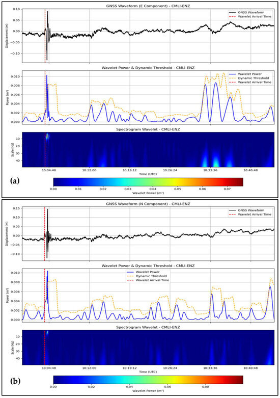 We considered the GNSS observations of the CMLI (297.62 km) and CBAL (352.43 km). The E and N onsets at CMLI (Figure 4a,b) had relatively strong wavelet power peaks at 10:04:07 UTC and 10:04:00 UTC, respectively. For the validation using SRSI (277.5 km, 10:03:24.9 UTC), they were +42.1 s (E) and +35.1 s (N) (Table 1). The onset time of the N component on CBAL at 10:04:39 UTC was stable (Supplementary Figure S3), where the time differences with BKB (344.1 km, 10:03:31.2 UTC) were +67.8 s. The onset times of the E component at CBAL (+204.8 s) and U components at the two stations (−154.9 s on CMLI, +201.8 s on CBAL) were less stable and might have been affected by site effects and the signal losses. The accuracy of the N component (+35.1 s to +67.8 s) shows that the method also works for intermediate distances.