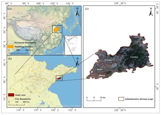 Schematic map of the main urban study area in Qingdao, Shandong Province, China. (a) The location of Shandong Province (orange) within China. (b) The position of the study area (dark red) within Shandong Province. (c) A satellite image showing the main urban districts of Qingdao, including Shinan, Shibei, Licang, and Laoshan. The administrative boundaries of each district are outlined in red.