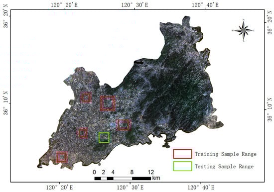 In this paper, domestic Gaofen-2 (GF-2) satellite multispectral imagery was employed as the primary research data, with data acquired from the China Resource Satellite Application Center. GF-2 is China’s first independently developed civilian optical remote sensing satellite with a spatial resolution better than 1 m. It is equipped with a Panchromatic and Multispectral Sensor (PMS), providing a spatial resolution of 1 m in the panchromatic band and a resolution of 4 meters in the multispectral bands. The imagery used in this paper features a spatial resolution of 1 m (after pansharpening). To ensure image quality and meet research requirements, a series of preprocessing operations, including radiometric calibration, atmospheric correction, orthorectification, and cloud removal, were performed on the raw images. Standard false-color composites generated from bands 4, 3, and 2 were utilized to produce 1-m resolution remote sensing images for the summers and winters of 2023. Urban green space classification requires substantial labeled training data related to green space targets; however, most existing publicly available datasets are designed for land cover mapping, and many urban green space datasets created from high-resolution imagery are not open-source, limiting their applicability for deep learning tasks. Therefore, in this paper, Google Earth imagery and winter GF-2 images were used primarily as reference data to support the annotation of summer GF-2 imagery, and six representative urban green space areas were selected based on field surveys. These areas covered typical types of urban green spaces, including centrally distributed urban parks (e.g., Signal Hill Park), sporadically distributed residential green spaces (e.g., residential areas in Licang District), and regularly distributed artificial green spaces (e.g., Qingdao International Golf Course). The selection of these regions aimed to reduce data redundancy, enhance analysis efficiency, and provide rich and diverse samples for subsequent model training and validation. The locations of the selected regions are presented in Figure 2.
