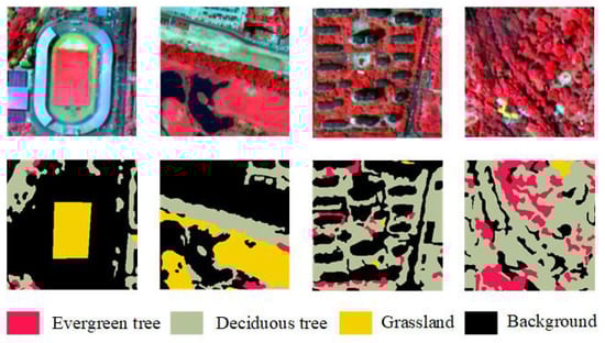 The contours of green space types were delineated through manual visual interpretation and were corrected using field survey data. Raster images were subsequently generated as ground truth labels. The images and corresponding labels were cropped into 256 × 256 pixels using the sliding window method. To address problems such as overfitting caused by the limited number of samples, a series of data enhancement operations, such as flipping, rotation, and translation, were performed on the samples in the paper. The dataset was divided into training, validation, and test sets in a ratio of 6:2:2, ensuring that no overlap existed among the three sets. The final constructed sample set comprised 1768 images of 256 × 256 pixels. A sample example is presented in Figure 3.