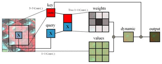 Secondly, the static interaction processing is realized by applying group convolution to all neighboring key values in the grid to obtain the static feature information of the input feature map X. Then, the static context information and query matrix Q are concatenated and processed by two consecutive convolution layers to obtain the attention weight matrix A:
