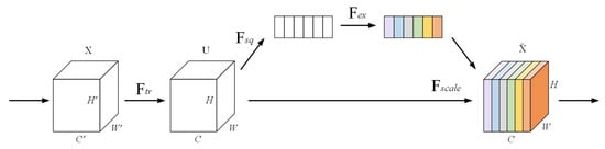 Structure of the SE module. The input tensor X undergoes sequential squeezing () and excitation () operations, and is subsequently scaled () to recalibrate the feature maps.