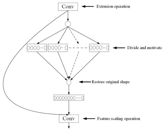 Structure of the Squeeze Aggregated Excitation module. The module starts with a global average pooling to extract channel-wise statistics, which is followed by a 1 × 1 convolution (“Extrusion operation”) to compress the features. The resulting descriptor is processed through multiple parallel fully connected branches (“Divide and motivate”) to generate aggregated excitation features. These features are concatenated and projected back to the original shape (“Restore original shape”). A final 1 × 1 convolution (“Feature scaling operation”) is applied to refine the recalibrated features.