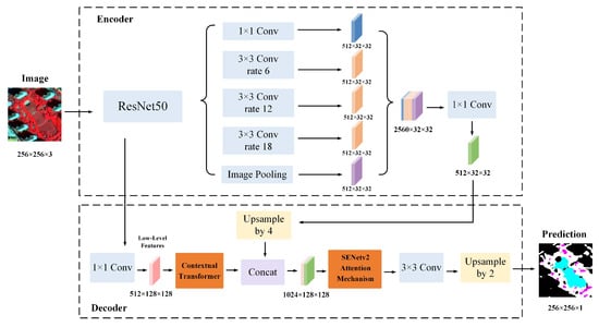 In recent years, deep learning methods have been widely applied in the field of remote sensing image segmentation due to their superior feature extraction capabilities [,,,]. Currently, deep learning-based semantic segmentation models for remote sensing imagery can be broadly categorized into two groups. The first group consists of models based on traditional convolutional neural networks (CNNs), such as the Fully Convolutional Network (FCN) [], U-Net [], and the DeepLab series [,]. These models extract hierarchical semantic information through successive convolutional operations and have demonstrated excellent pixel-level classification accuracy and strong algorithmic robustness in various remote sensing tasks, including water body detection, object extraction, and land surface classification [,,]. Numerous enhancements have been proposed to further improve the performance of these CNN-based architectures. For instance, Shi et al. [] incorporated the CBAM attention module into the U-Net framework and developed a water body segmentation approach applicable to multi-source remote sensing data. Men et al. [] introduced CRAUNet by combining residual connections with a channel attention mechanism, which effectively improved segmentation accuracy in complex urban green space environments. Zhang and Zhao [] proposed an improved DeepLabV3+ architecture by optimizing the atrous spatial pyramid pooling (ASPP) module and introducing an attention-based feature fusion module (AFFM), resulting in better segmentation performance under complex background conditions. Among these approaches, DeepLabV3+ has demonstrated particularly strong performance in semantic segmentation tasks involving natural scenes. Its multi-scale feature extraction mechanism significantly enhances the ability to capture objects across varying spatial scales, while the encoder–decoder structure facilitates more effective reconstruction of spatial features [,,]. Nevertheless, most existing studies have concentrated on optimizing the encoder component, with limited emphasis on enhancing the capacity of the decoder to reconstruct high-dimensional features and recover fine spatial details [,]. This architectural imbalance constrains the potential for further advancements in fine-grained remote sensing classification.