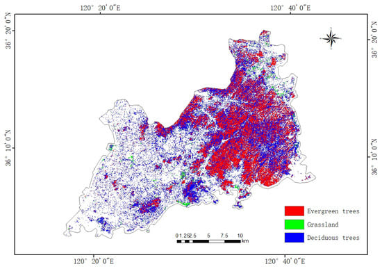 The classification results show that the urban green space in the main urban area of Qingdao presents obvious spatial heterogeneity characteristics. Deciduous trees are mainly distributed in the central area of the city, covering the largest area of about 154.41 km2, indicating that seasonal vegetation dominates the urban green space system. Evergreen trees cover an area of 120.20 km2, mainly concentrated in the southern and southeastern regions, which is important for maintaining the city’s perennial greening and ecological stability. In contrast, the area of grassland is only 7.50 km2, which accounts for a relatively small proportion of the total green space in the city and is mainly distributed in the form of scattered patches.