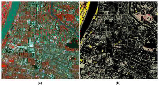 GF-2 imagery and corresponding urban green space classification results for the selected area in Nanjing. (a) Original GF-2 satellite image. (b) Classification results generated by the proposed model.