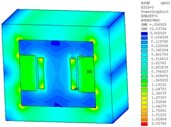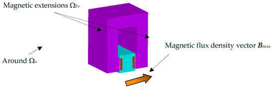 From the models and their analyses using the finite element method [20,21,22], it is clear that a magnetic circuit can be constructed using permanent magnets. Therefore, the first concept design was modified into the shape shown in Figure 3. Subsequently, the analysis and evaluation from the proposed geometrical model were carried out; the distribution of magnetic induction B (Figure 4) was found, as well as the relative permeability μr and other EMG field quantities. The permanent magnet FeNeB was considered, Hc = 850 kA/m, Br = 1.2 T.