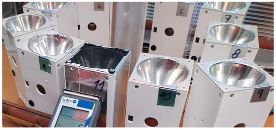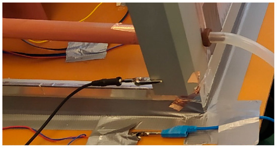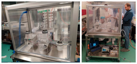 The polycarbonate was coated with foil to minimize electrical charge on the wall surfaces. The entire enclosure was connected to a single reference potential in the next step (Figure 6). The enclosure was sealed with a front wall that was hermetically sealed prior to testing (Figure 7). In the test box with safe separation from the external environment, the methods were tested using the prepared equipment [15,17,22]. Aerosol was generated from the bottom of the box using a vertical glass tube. An example of the placement and testing of the designed sensors with the Wien filter [20] is shown in Figure 7.