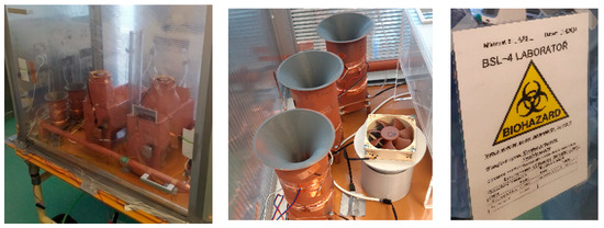 The construction of the enclosure for testing biological agents in air aerosols was constructed from anodized aluminum L-sections and filled with polycarbonate (Figure 5) so that the test area was hermetically sealed from the surrounding environment and the operator.