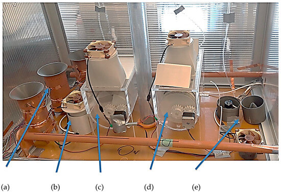 Test box with the sampling devices: (a) aerosol uses the electrodynamic separation of agents (EHDS): (b) large aerosol passage method (LAP) and direct contact with the preservative fluid; (c) gas-permeable mesh (GPM) setup and direct rinse with preservative fluid; (d) aerosol drift over (ADO) a large area washed with containment fluid; and (e) aerosol contact with liquid (ACWL) driven by a pump.