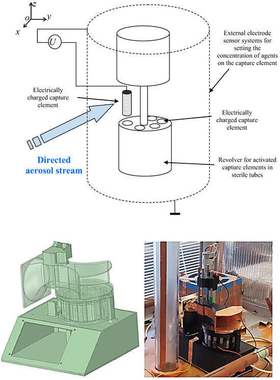 Other devices, such as electrostatic aerosol samplers for optical and electron microscopy [29,30], operate under entirely different pressure and aerosol concentration conditions compared to our system, which works with ambient air. The design presented in [31], “A prototype personal aerosol sampler based on electrostatic precipitation and electrowetting-on-dielectric actuation of droplets,” appears superficially similar, but it applies +/−4.7 kV electrode voltages. Given its construction and electrode potential, it likely destroys biological particles and DNA, rendering it unsuitable for pathogen sampling and detection.