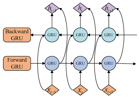 As seen in Figure 1 of the BiGRU structure, a BiGRU is a model that is based on a GRU and incorporates forward and backward feature considerations for sequence information [31]. It is composed of two separate GRUs. Its forward and backward GRUs are represented in the following equation: