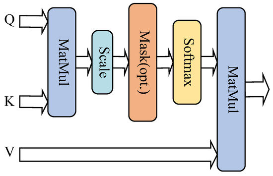 One of the main elements of the Transformer model is the scaled dot product attention mechanism (SDPA). The ability of the SDPA to process all of the sequence’s elements at once through matrix operations makes it more computationally efficient than traditional attention mechanism algorithms. It also has a strong ability to capture long-distance dependencies, which is particularly crucial when handling bearing failure signals with complex structures and long-distance dependencies [32]. As seen in Figure 2, the structure of the SDPA and its formula can be expressed as follows: It calculates the dot product between the query vector (Query), the key vector (Key), and the value vector (Value) in order to measure the correlation. It also stabilizes the computational process by scaling operations.