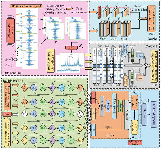 In this section, we first introduce the ResNet-CACNN-BiGRU-SDPA method and diagnostic logic proposed in this paper and then explain the contributions of each part in detail. The method in this paper constructs a bi-domain feature association model, which focuses on solving the problem of incomplete and insufficient feature extraction in general methods, and enhances the model’s adaptability to noisy environments through the SDPA structure.
