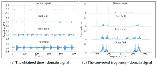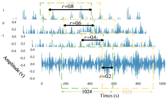 - One-dimensional time-domain signals are converted into one-dimensional frequency-domain signals using the Cooley–Tukey technique, based on a multi-window sliding-window overlapping sampling technique to gather signals from the original data, which enriches the acquired data features, and then adding Gaussian white noise to improve the model’s adaptability to the noise;