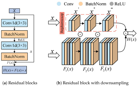 The structure of the residual block in Figure 5a illustrates how in Equation (13) may be viewed as the fusion result of the convolutional layer, batch normalization, and activation function ReLU operations in the residual block, the input feature x first passes through the 3 × 3 convolutional layer, and then accelerates the training process and activates the feature by BatchNorm1d and ReLU, and finally passes through a 3 × 3 convolutional layer, as well as BatchNorm1d, to obtain the output , and the final output is obtained by summing the input x with the output of the convolutional layer .