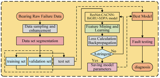 The fault diagnosis flow of the ResNet-CACNN-BiGRU-SDPA method based on time–frequency dual domains and feature fusion is shown in Figure 7, which is divided into three main stages: