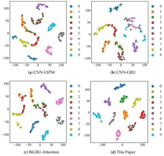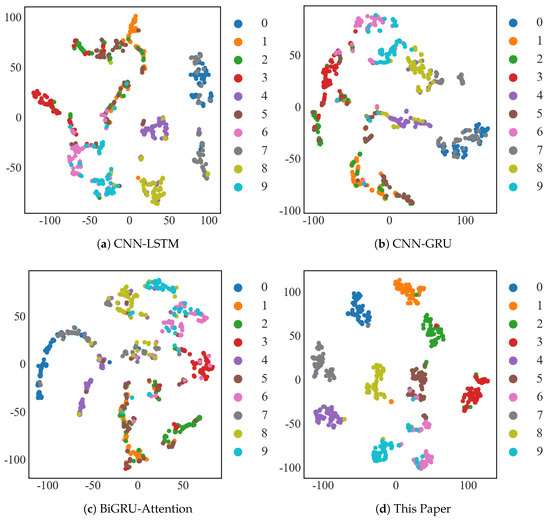 As illustrated in Figure 16, the CNN-LSTM, CNN-GRU, and BiGRU-Attention models were chosen for T-SNE visualization experiments on the JNU dataset under a 10-sample condition in this research.
