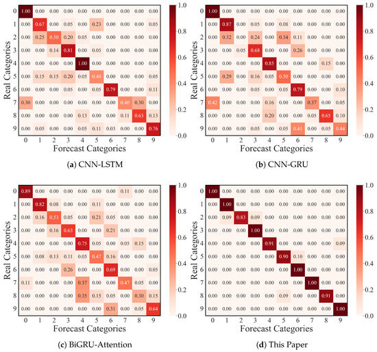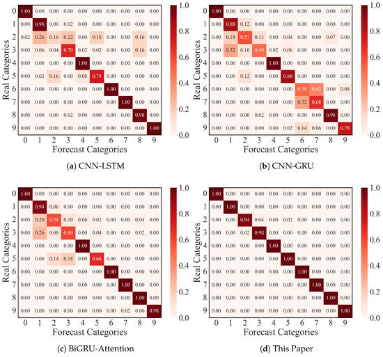 The confusion matrix experiment, which was based on the JNU dataset and had ten samples, is depicted in Figure 17. The CNN-LSTM, CNN-GRU, and BiGRU-Attention models in this experiment were unable to correctly identify the bearing fault types 2, 3, 7, and 8, but the current model was able to identify the ten fault types more accurately, demonstrating its superior fault diagnosis performance once more.