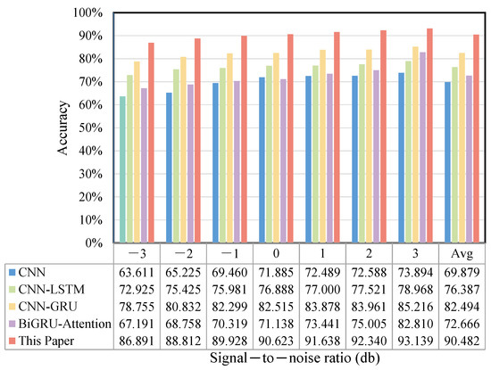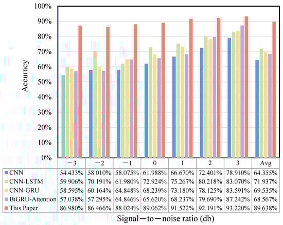 The robustness and generalization ability of the model in complex environments were also tested using the noise perturbation experimental method. The model parameters remained the same, there were 100 samples, and the comparison models were CNN, CNN-LSTM, CNN-GRU, BiGRU-Attention, and this model. The diagnostic accuracies of this paper’s model and the comparative models under various noise perturbations are displayed in Figure 18, where the signal-to-noise ratio is plotted on the horizontal axis. The maximum noise difference under various signal-to-noise ratios was 6.248%, which is a good anti-noise performance, with a higher diagnostic accuracy and robustness compared with the other four models. It is evident that the diagnostic accuracy of this model of this paper was not significantly affected under different noise perturbations.
