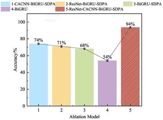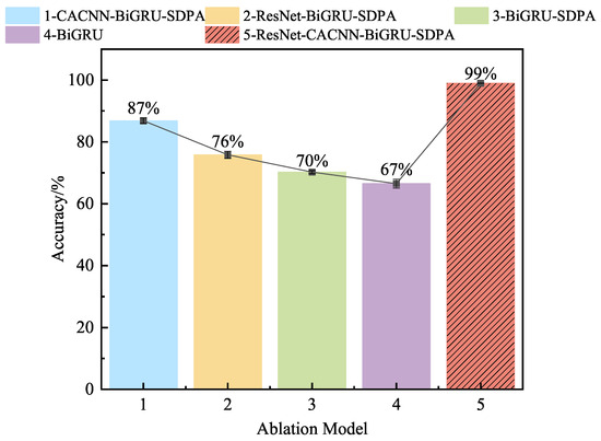 As depicted in Figure 13 for the ablation experiment image, we continued to conduct ablation experiments with the working condition of a 1HP signal with a sample number of 10 and the CWRU dataset, in order to elucidate the degree of influence and contribution of each module in the ResNet-CACNN-BiGRU-SDPA model proposed in this paper to the fault diagnosis performance.