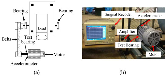 The Jiangnan University (JNU) bearing dataset [39], which was gathered from the failure signals of a centrifugal fan system employing a Mitsubishi SB-JR induction motor, was used in the second experiment of this work. A test rig sketch is displayed in Figure 14a, and the motor was a 3.7 kW three-phase induction motor. The entire experimental setup contained one damaged bearing, which was found in the motor’s output shaft. Figure 14b depicts the sensor mounting location and the perspective of the motor.