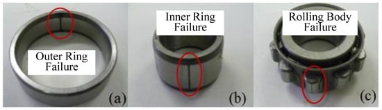 Faulty bearing. (a) Outer ring failure. (b) Inner ring failure. (c) Rolling body failure.