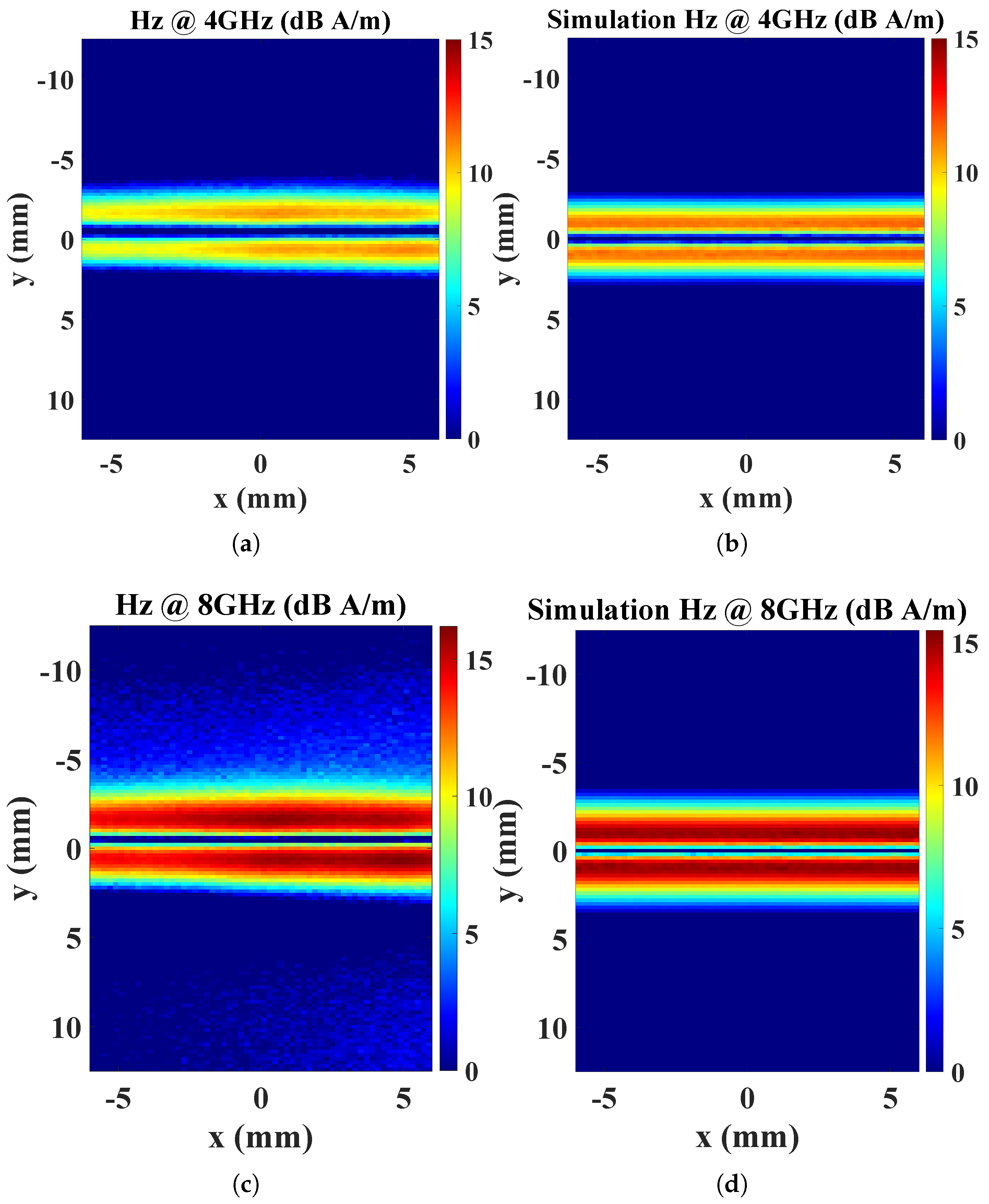 Magnetic field distributions measured by the proposed probe: (a) measurement results at 4 GHz; (b) simulation results at 4 GHz; (c) measurement results at 8 GHz; (d) simulation results at 8 GHz.